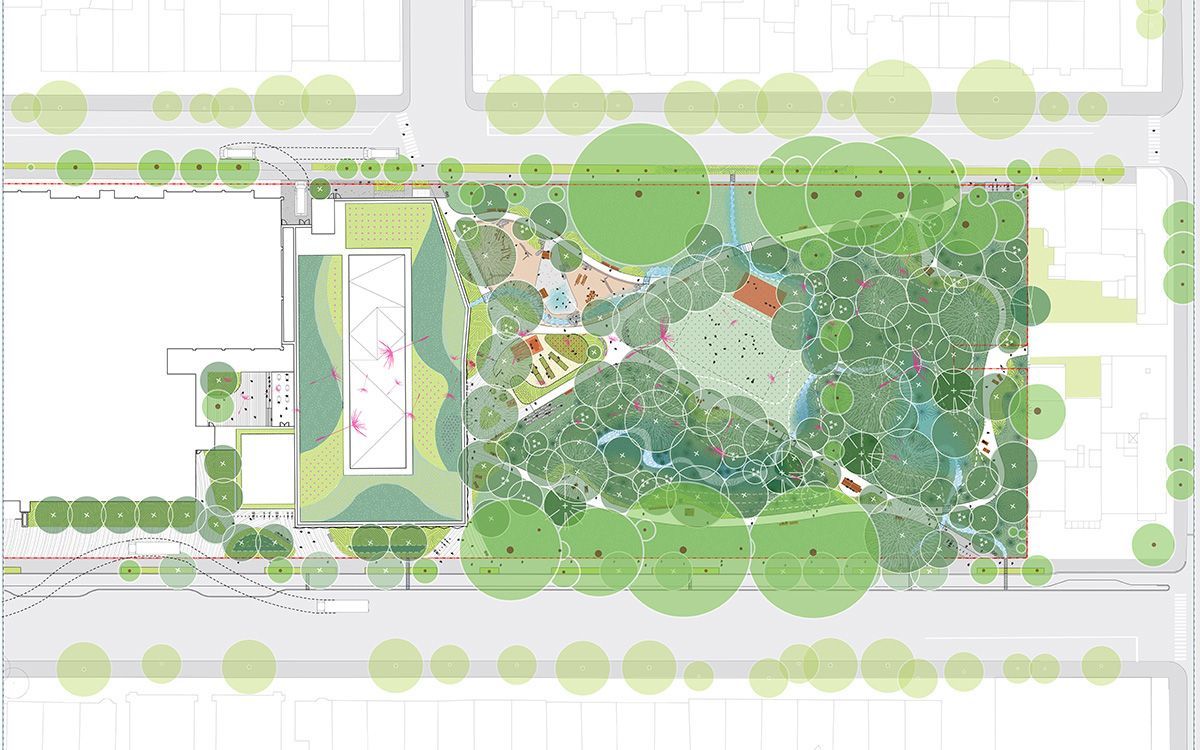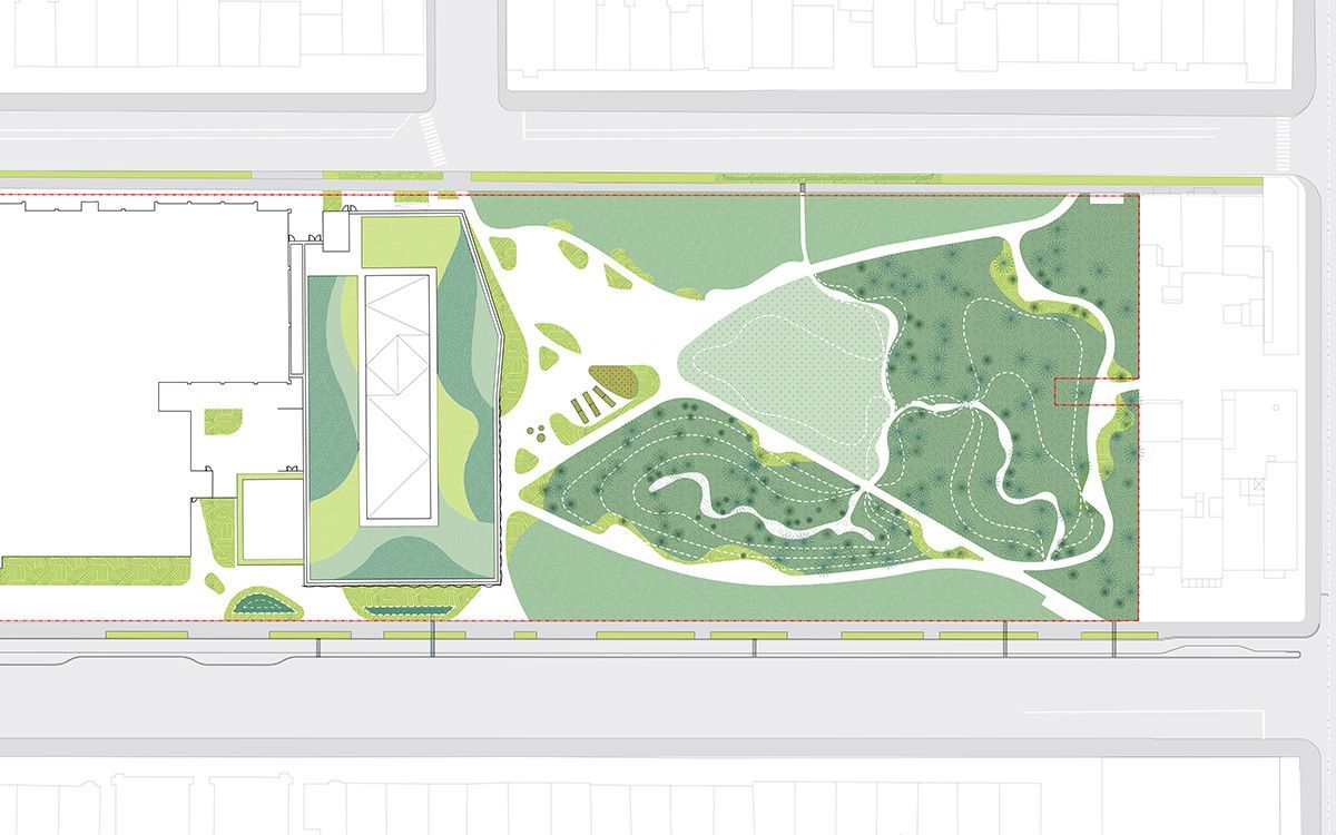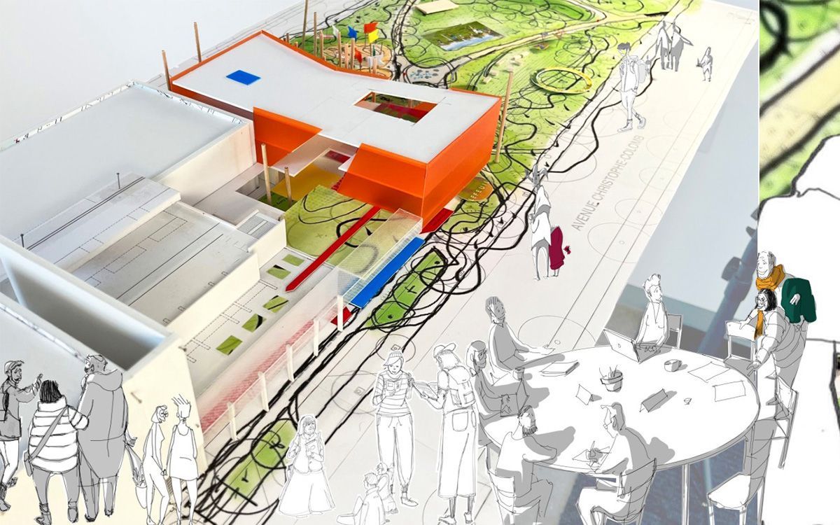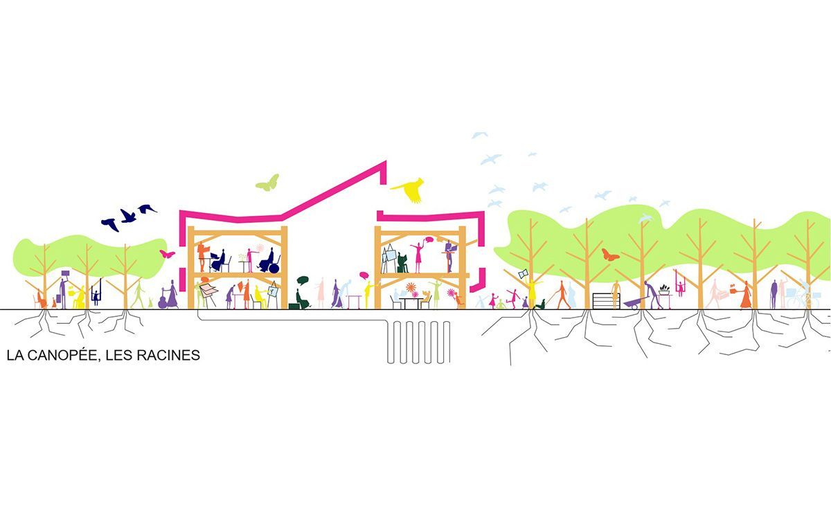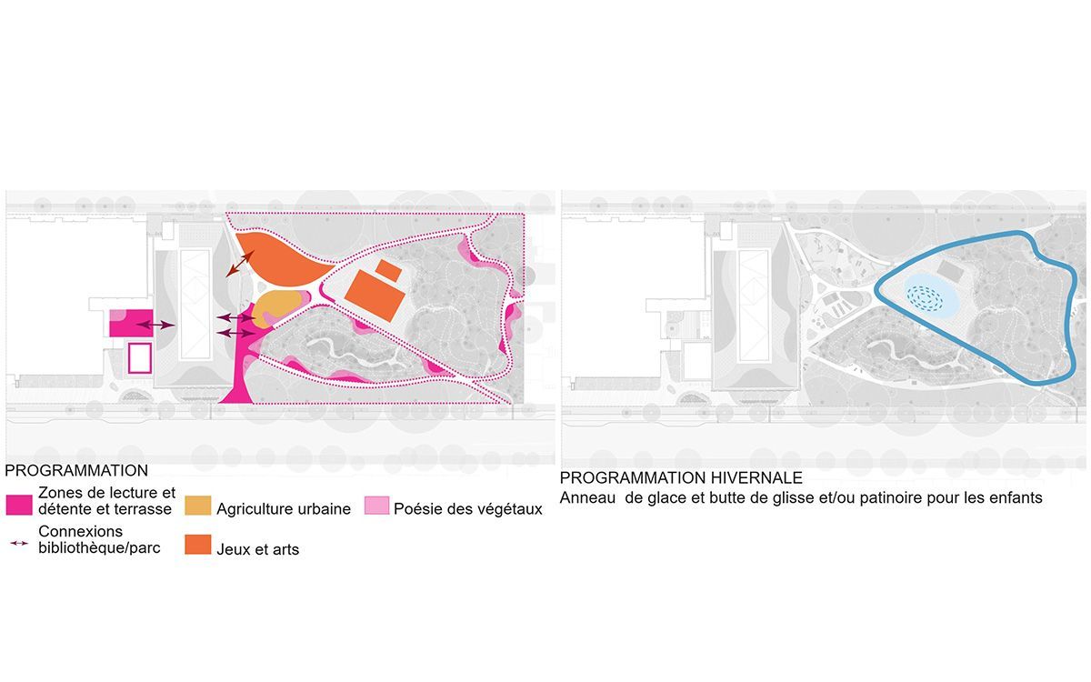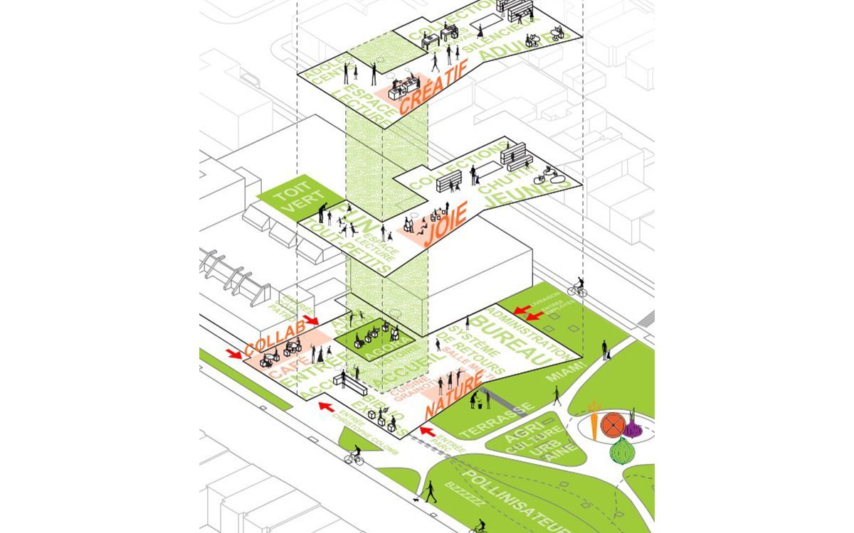 Winning project (1st prize) in the multidisciplinary architecture competition for the construction of a new library and the redevelopment of a park for the borough of Villeray–Saint-Michel–Parc-Extension. In keeping with the community spirit of the recreational and cultural hub in which the project is located, the library is integrated with a resilient oasis park, nourished by rain and enlivened by culture. This complex offers a lively and diverse landscaping program: urban agriculture gardens, family spaces, relaxation and reading areas, a playground, and a food forest. Designed to preserve as many existing trees as possible, the project is framed by large Carolina poplars that carry the memory of the Patro, the neighborhood, and the city.