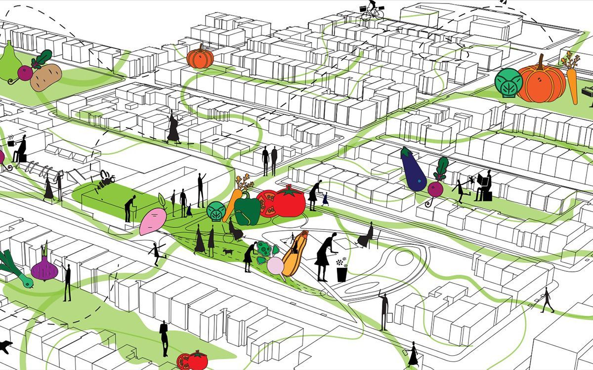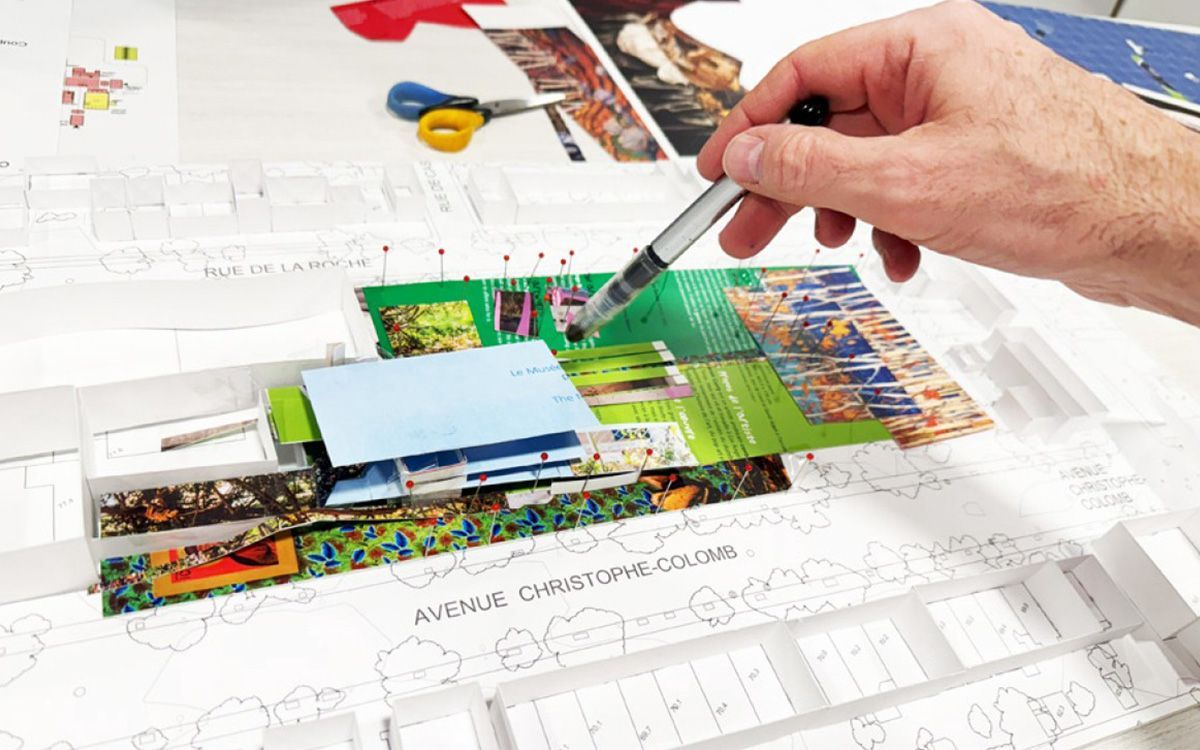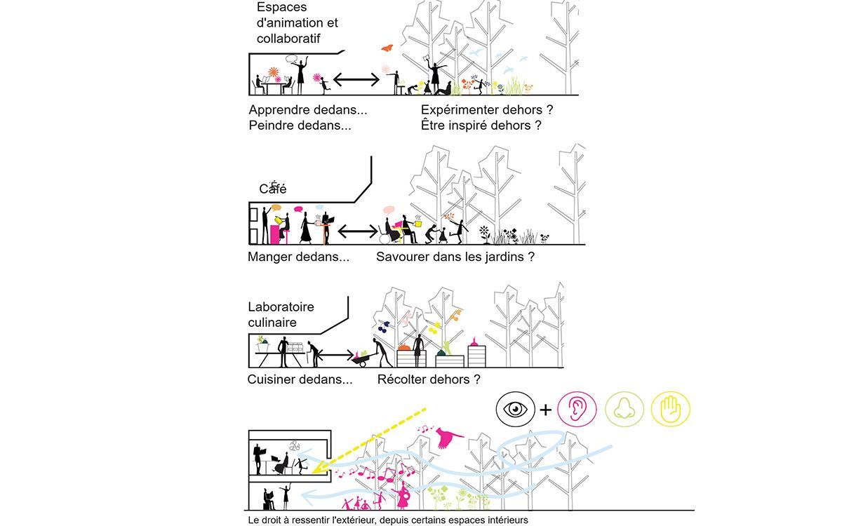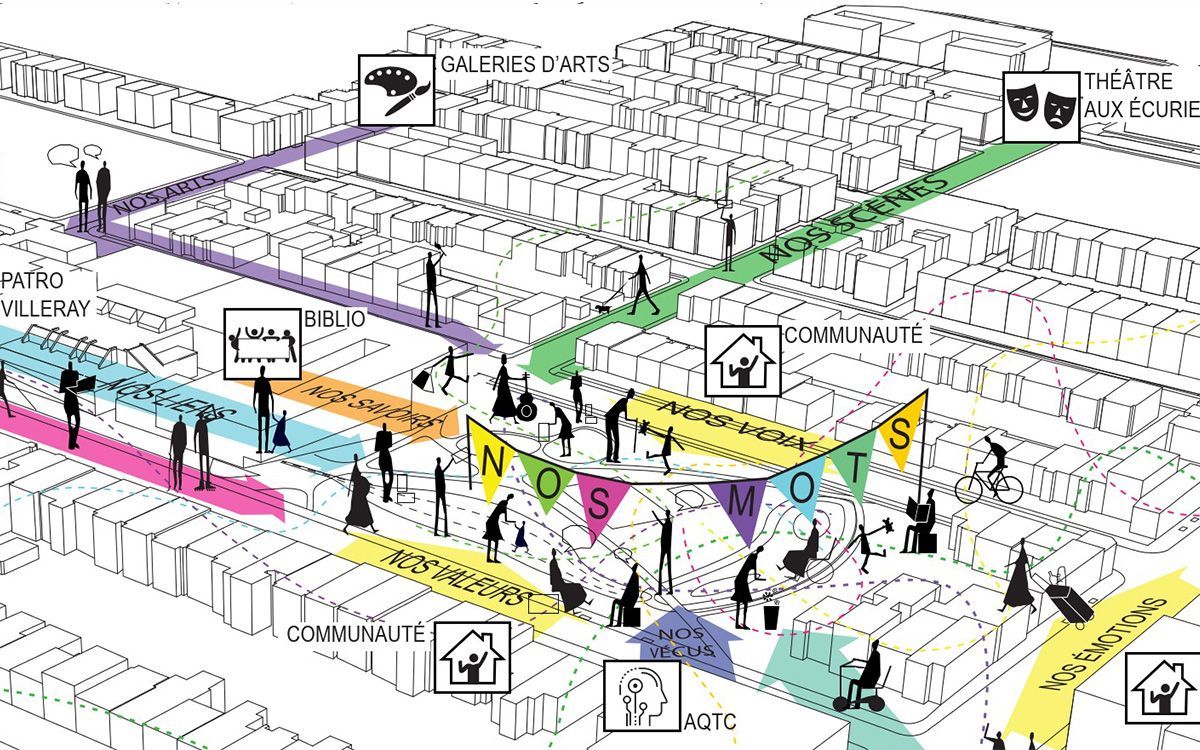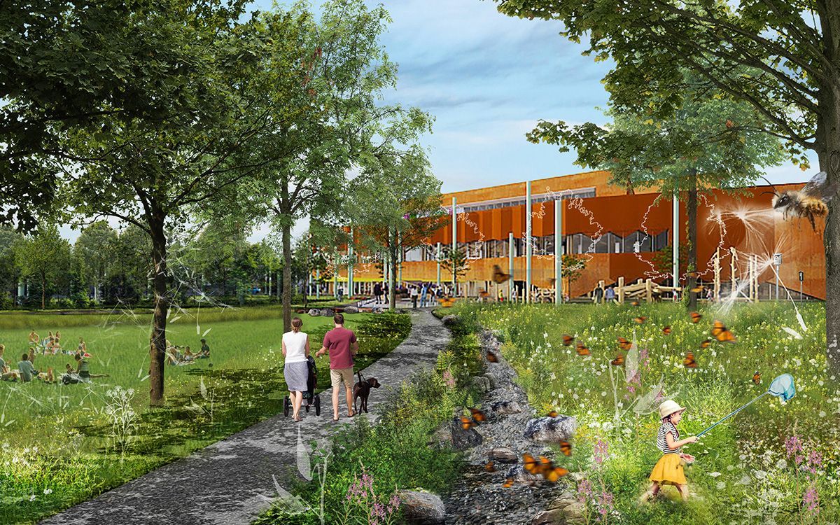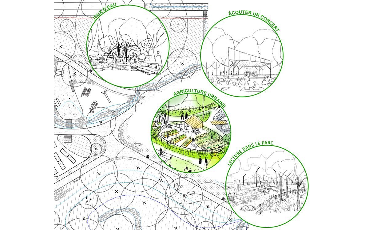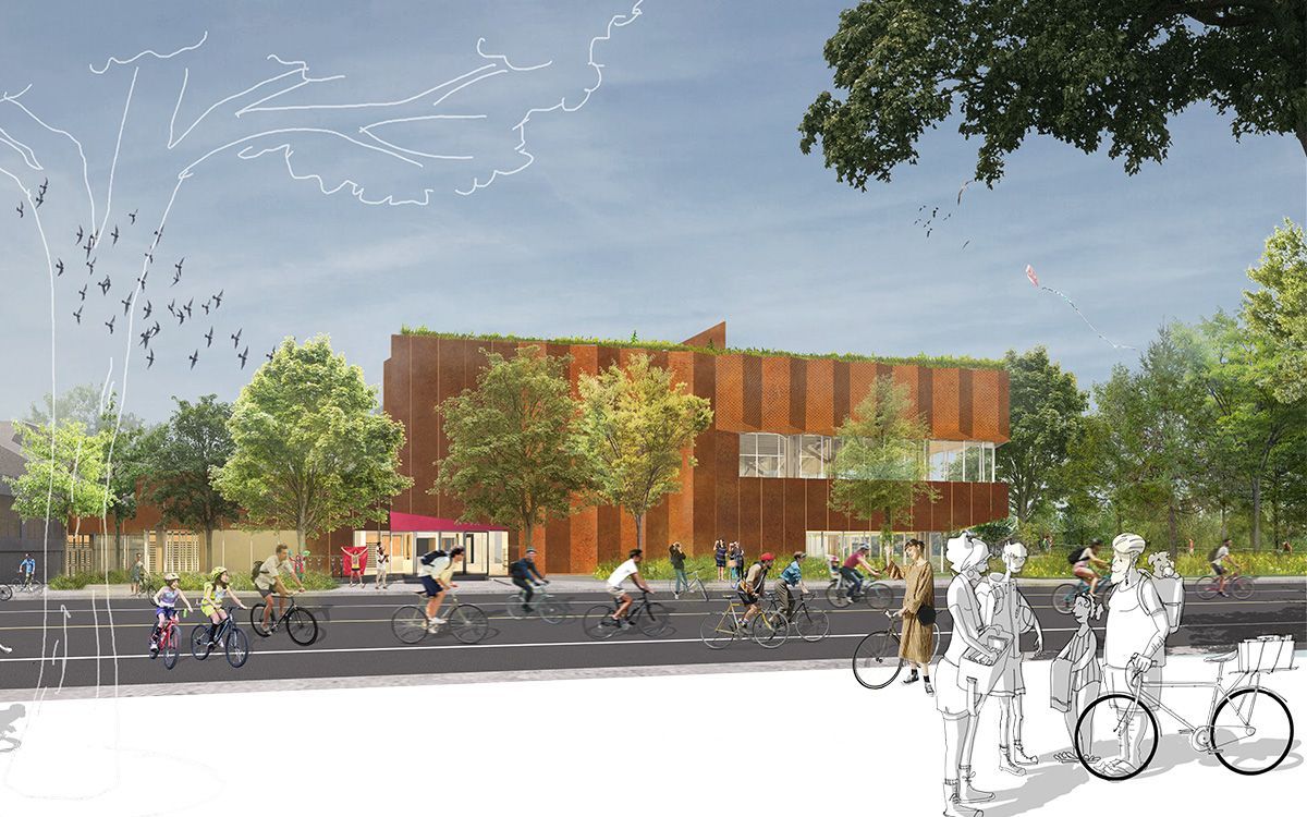 Winning project (1st prize) in the multidisciplinary architecture competition for the construction of a new library and the redevelopment of a park for the borough of Villeray–Saint-Michel–Parc-Extension. In keeping with the community spirit of the recreational and cultural hub in which the project is located, the library is integrated with a resilient oasis park, nourished by rain and enlivened by culture. This complex offers a lively and diverse landscaping program: urban agriculture gardens, family spaces, relaxation and reading areas, a playground, and a food forest. Designed to preserve as many existing trees as possible, the project is framed by large Carolina poplars that carry the memory of the Patro, the neighborhood, and the city.